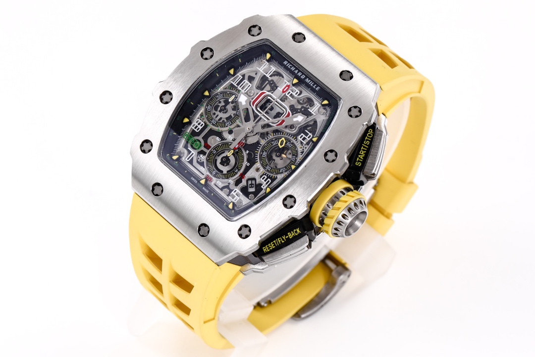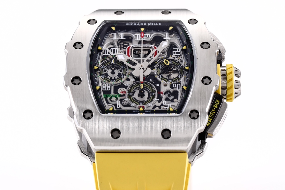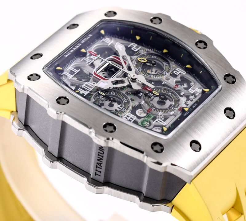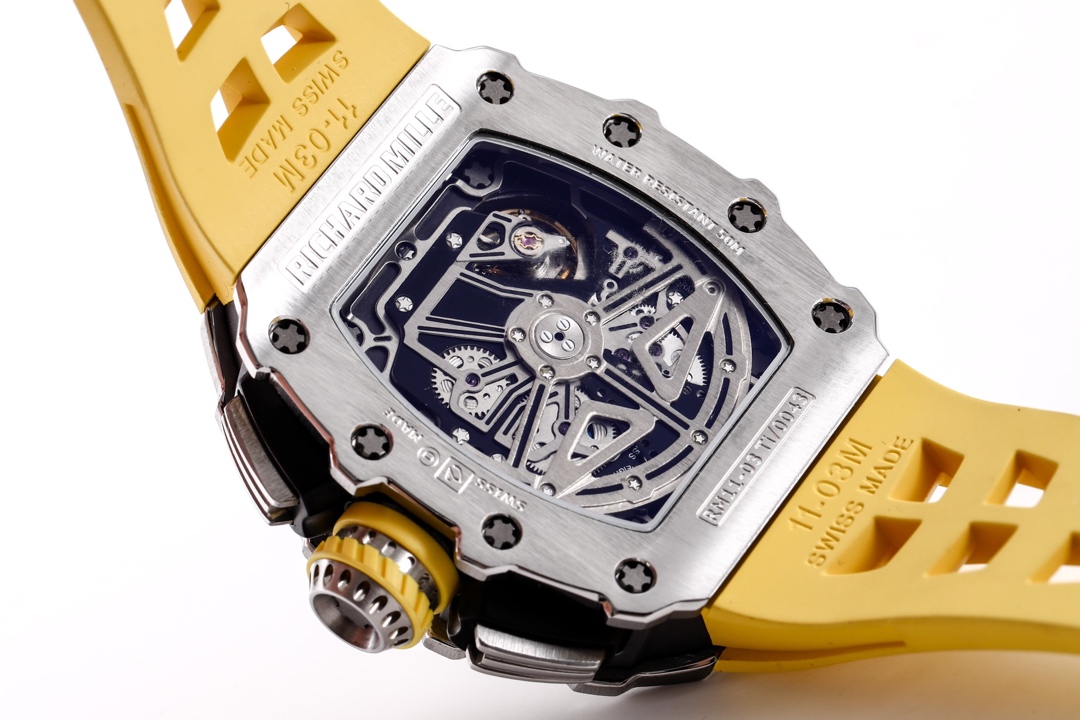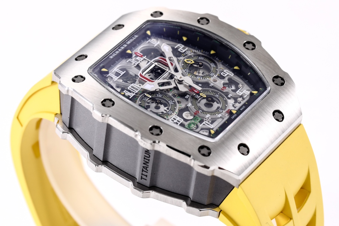 🔥🔥🔥 The KV Richard Mir RM11-03RG series is an iconic building of the brand that pursues perfection through its perfect ergonomic design. Each component of RM 011 is an aesthetic expression of its functionality. The RM 11-03 watch retains its most recognizable iconic appearance, but the craftsmanship used is still far superior to before. In the case section, the titanium version is shown in the picture, but there are also rose gold and titanium versions to choose from. However, regardless of which one, they all have finely crafted brushed surfaces, matched with polished chamfers, showing a sharp contrast. The timing button is clearly labeled with functional fonts (Start/Stop and Reset/Fly back), and its design inspiration comes from the pedal optimization changes in F1 racing. All of these modifications make this RM 11-03 Flyback Automatic Watch more sporty and trendy than previous models.