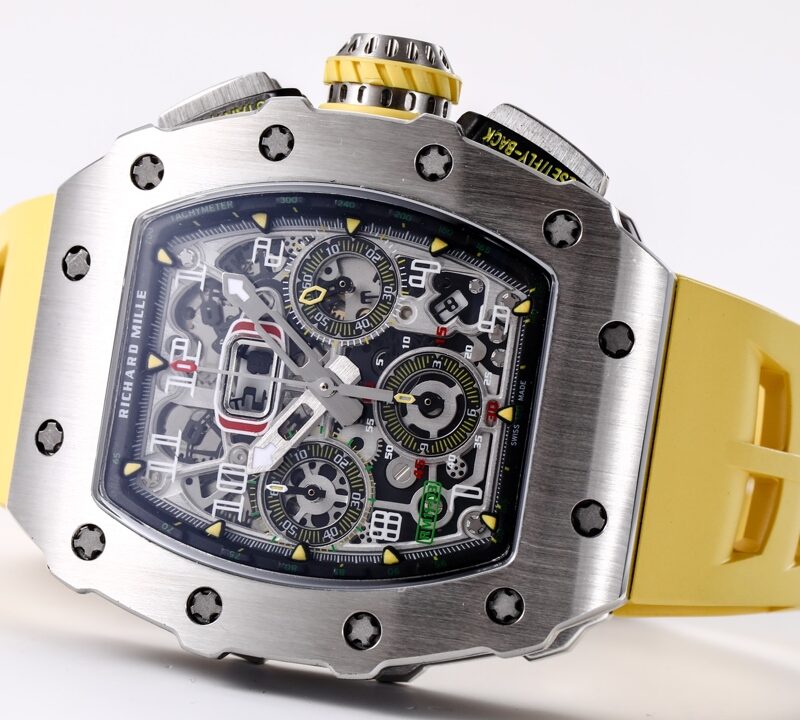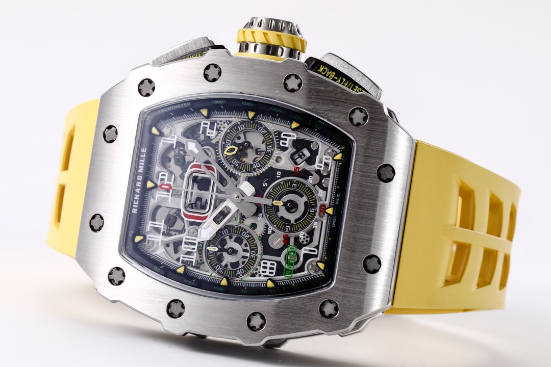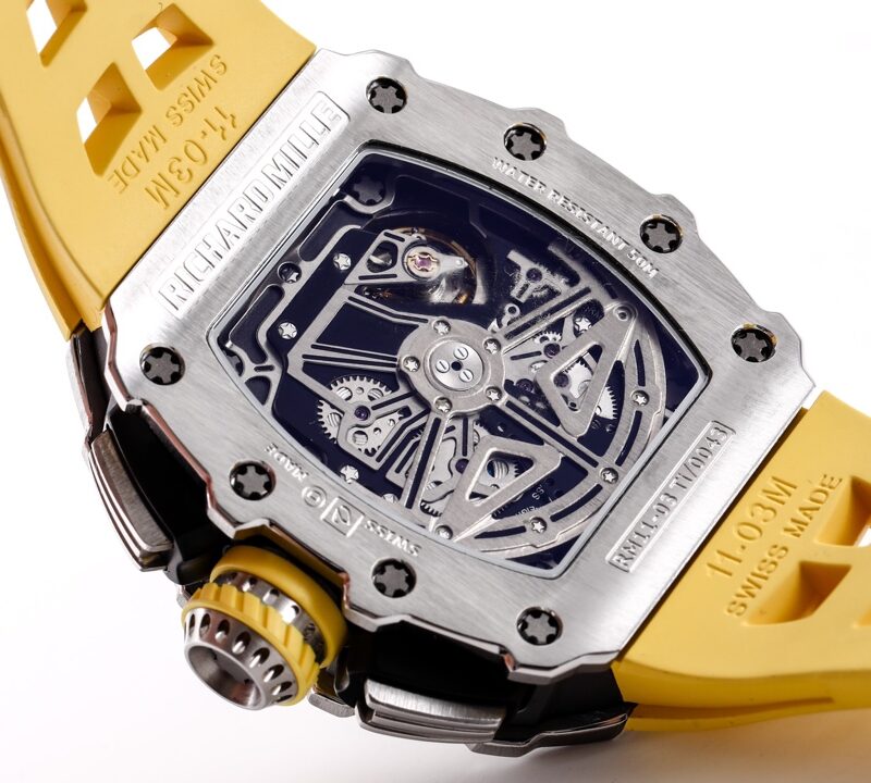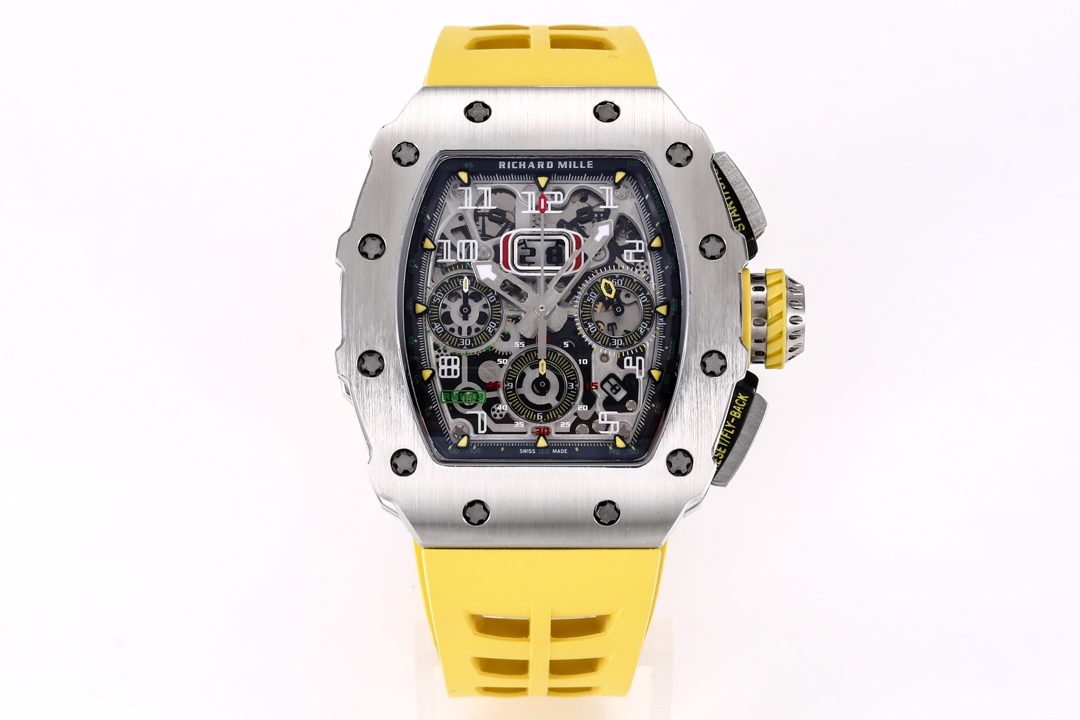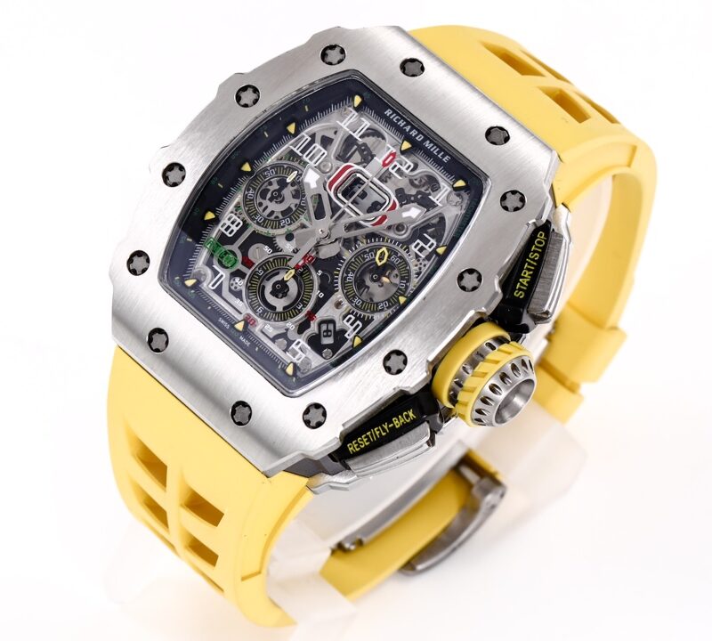 🔥🔥🔥 The KV Richard Mir RM11-03RG series is an iconic building of the brand that pursues perfection through its perfect ergonomic design. Each component of RM 011 is an aesthetic expression of its functionality. The RM 11-03 watch retains its most recognizable iconic appearance, but the craftsmanship used is still far superior to before. In the case section, the titanium version is shown in the picture, but there are also rose gold and titanium versions to choose from. However, regardless of which one, they all have finely crafted brushed surfaces, matched with polished chamfers, showing a sharp contrast. The timing button is clearly labeled with functional fonts (Start/Stop and Reset/Fly back), and its design inspiration comes from the pedal optimization changes in F1 racing. All of these modifications make this RM 11-03 Flyback Automatic Watch more sporty and trendy than previous models.